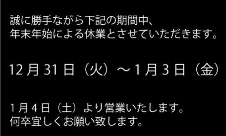 年末年始休業を下記の通りとさせて頂きます。何卒ご了承下さいますようお願い申し上げます。2019年12…