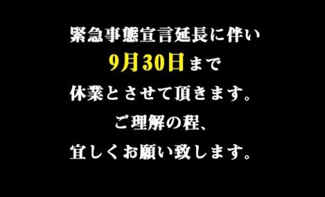 緊急事態宣言延長に伴い9月30日まで休業とさせて頂きます。ご理解の程宜しくお願い致します。